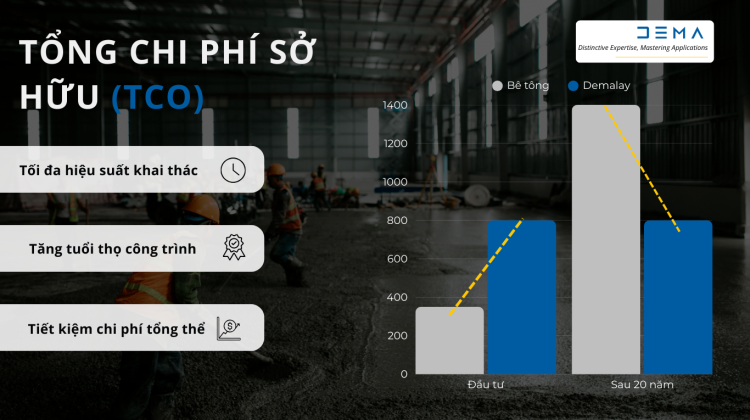 → Nếu khu vực cần sửa chữa yêu cầu độ dày lớp phủ mỏng (từ 10mm-50mm) nhưng vẫn phải chịu được tải trọng xe container và cần thông xe sớm, Demalay là lựa chọn vượt trội. Bê tông thông thường ở độ dày này rất dễ nứt và bong tróc, đồng thời cần ít nhất 28 ngày để đạt cường độ, gây gián đoạn kinh doanh dài ngày.