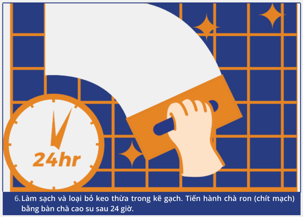 - Chà ron (Chít mạch): Tiến hành chà ron sau ít nhất 24 giờ kể từ khi hoàn tất việc dán gạch.