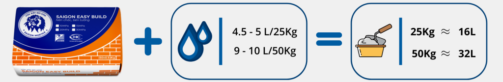 - 2. Pha trộn: Trộn đều trong khoảng 3-5 phút cho đến khi hỗn hợp đạt độ đồng nhất. Khuyến khích sử dụng máy trộn tại công trường.